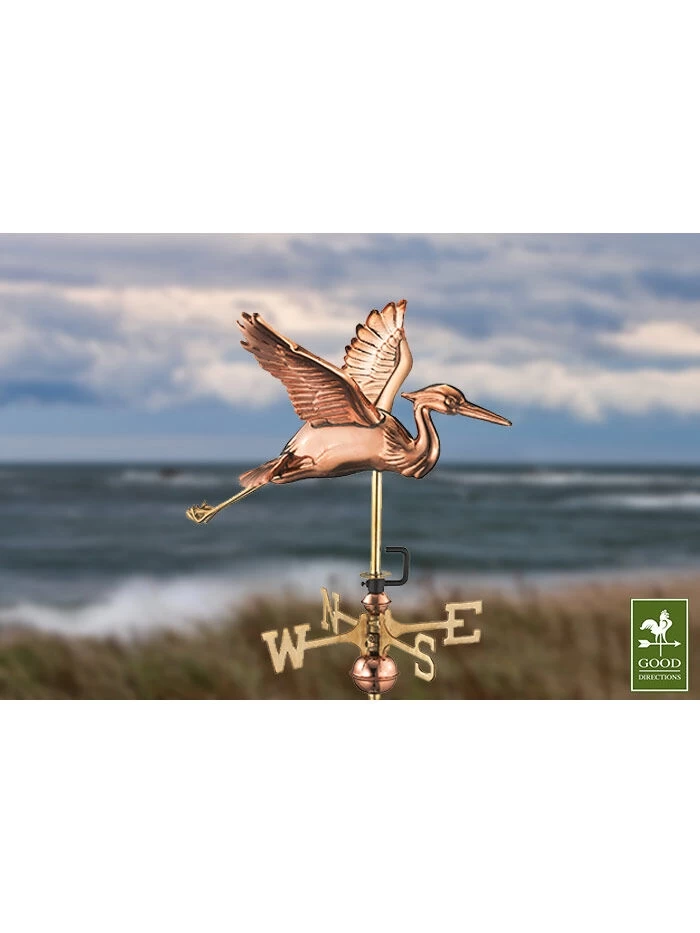 Heading away from his marsh pond nest, this Great Blue Heron is ready to adorn the rooftop of smaller structures, sheds, and gazebos. For over 35 years Good Directions pure copper weathervanes have been unsurpassed in style, quality, and durability – perfect for the house-proud homeowner. Bring the Joy of Outdoor Livingâ„ to your home with this heirloom-quality piece. Easy-to-assemble and install. Includes an all-weather Roof Mount and assembly rod, solid brass 11″L directionals and copper globes. This size weathervane is ideal for smaller structures, sheds and gazebos. Lifetime Warranty. The beautiful Blue Verdeâ„ Copper instantly displays the historic look of aged copper. The Pure Copper will age naturally over time.