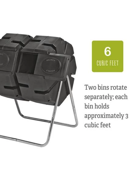 - Two bins rotate separately; each bin holds approximately 3 cubic feet