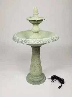 Includes 12 Volt submersible pump with 12 foot power cord (for 110 volt grounded outlet). Lightweight, attractive, and very durable made from 70% clay and 25% polyresin. Four pieces easily screw together to create the tiered fountain. The pedestal is hollow and can be filled with sand to increase stability in heavy wind areas.