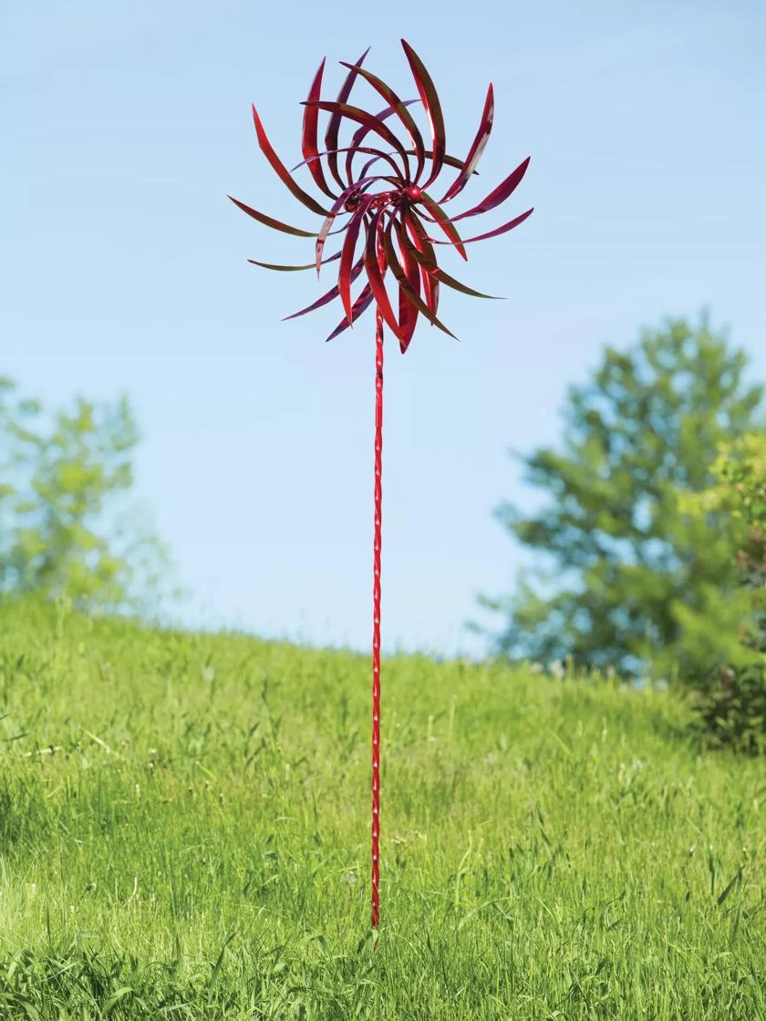 This bright metallic-colored wind spinner will be an added attraction in your garden or landscape. We recommend facing toward prevailing wind. Loose soil installation: we recommend embedding stake in concrete. To prevent weathering, additional clear poly coats can be applied.